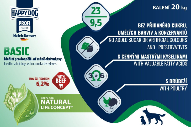 Happy Dog Profi Essential Basic 23/9,5 je prírodné základné kompletné krmivo s cennými ingredienciami z bavorskej prírody. Tvrdé chrumkavé granuly prinášajú vysoko kvalitné bielkoviny z lahodnej hydiny . Tieto veľmi chutné granuly obsahujú aj zdravé regionálne celozrnné obilniny (kukurica, pšenica). Hydinové a hovädzie mäso poskytuje vášmu psovi vysoko kvalitné živočíšne bielkoviny a dodáva psovi energiu potrebnú na šantenie a hranie. Regionálne obilniny patria medzi najdôležitejšie zdroje vlákniny, ktorá reguluje črevnú činnosť, zasýti a podporuje zdravé trávenie. Šetrne spracované obilie poskytuje aj mnoho vitamínov B, minerálnych látok ako je horčík, železo, selén a zinok a sú plné komplexných sacharidov. Jedinečne chutná receptúra je zušľachtená miestnymi bylinami, ktoré poskytujú vášmu štvornohému priateľovi mnoho cenných prírodných živín pre imunitu a celkové zdravie. Toto vyvážené, chutné krmivo pre psov je ideálne pre dospelých, normálne fyzicky aktívnych psov všetkých plemien, najmä pre pracovné a športové psy v období bez fyzickej záťaže a výkonnosti.