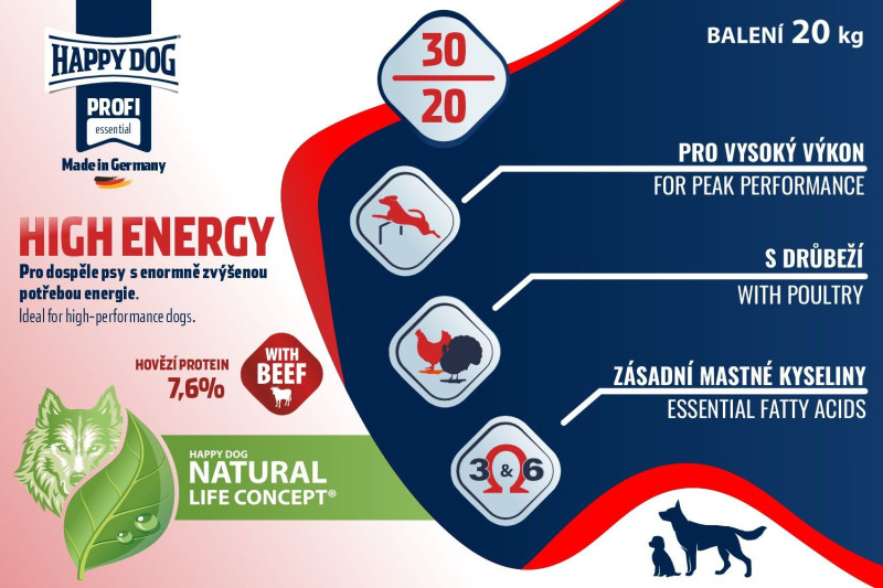 Prírodné základné kompletné krmivo Happy Dog Profi Essential High Energy 30/20 s cennými ingredienciami z bavorskej prírody vám ponúka na živiny bohatú výživu s vysokým obsahom stavebných bielkovín a pohotovej energie na pokrytie vysokých živinových nárokov pracovných alebo športových psov v období ich vysokej výkonnostnej aktivity. Vysoké množstvo bielkovín zaisťuje dostatočnú tvorbu výkonného telesného svalstva a pre obnovu spotrebovaných krvných bielkovín. Vysoko kvalitné živočíšne a rastlinné tuky dodávajú pohotovú a zásobnú energiu potrebnú na ťažkú svalovú prácu. Chrumkavé granule prinášajú vysoko kvalitné stavebné bielkoviny z hovädzieho mäsa, lahodnej hydiny a chutných rýb. a tiež zdravé regionálne celozrnné obilniny (kukurica, pšenica), ktoré patria medzi najdôležitejšie zdroje vlákniny, ktorá reguluje črevnú činnosť, zasýti a podporuje zdravé trávenie. Šetrne spracované obilie poskytuje aj mnoho vitamínov B, minerálnych látok ako je horčík, železo, selén a zinok a sú plné komplexných sacharidov. Jedinečne chutná receptúra je receptúra je zušľachtená prídavkom jedinečného Happy Dog Natural Life Concept®, ktorý poskytuje vášmu atlétovi mnoho cenných prírodných živín pre imunitu a celkové zdravie a je obohatená aj o cenné novozélandské morské mušle (Slávka pyskatá) na podporu kĺbov. Krmivo preto možno nasadiť u všetkých pracovných a športových psov v období ich enormne zvýšenej fyzickej záťaže.